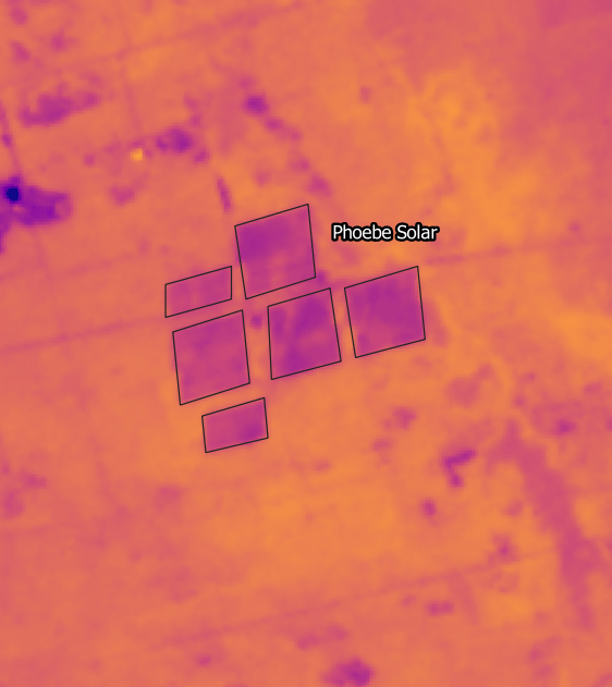 Findings of the analysis were surprising: the LST where the solar projects were located was actually lower than the surrounding areas. On average, the LST measured at solar sites was 10 degrees (F) cooler vs the surrounding area. This can observed in the image above where the darker purple colors represent cooler LST vs the lighter yellow which represents warmer LST. A close up on the Phoebe Solar project is included below where this contrast can be observed in more detail.
